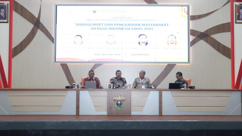 Makassar, 4 Desember 2024 – Lembaga Penelitian dan Pengabdian kepada Masyarakat (LPPM) Universitas Hasanuddin (UNHAS) sukses menyelenggarakan Seminar Nasional Riset dan Pengabdian kepada Masyarakat (SEMRIPMAS) 2024. Acara yang digelar pada 4 Desember 2024 ini mengusung tema “Sinergi Riset dan Pengabdian Masyarakat Menuju Indonesia Emas 2045,” bertujuan untuk memacu kolaborasi antara dunia akademik, pemerintah, dan masyarakat dalam menyongsong visi Indonesia Emas 2045.
