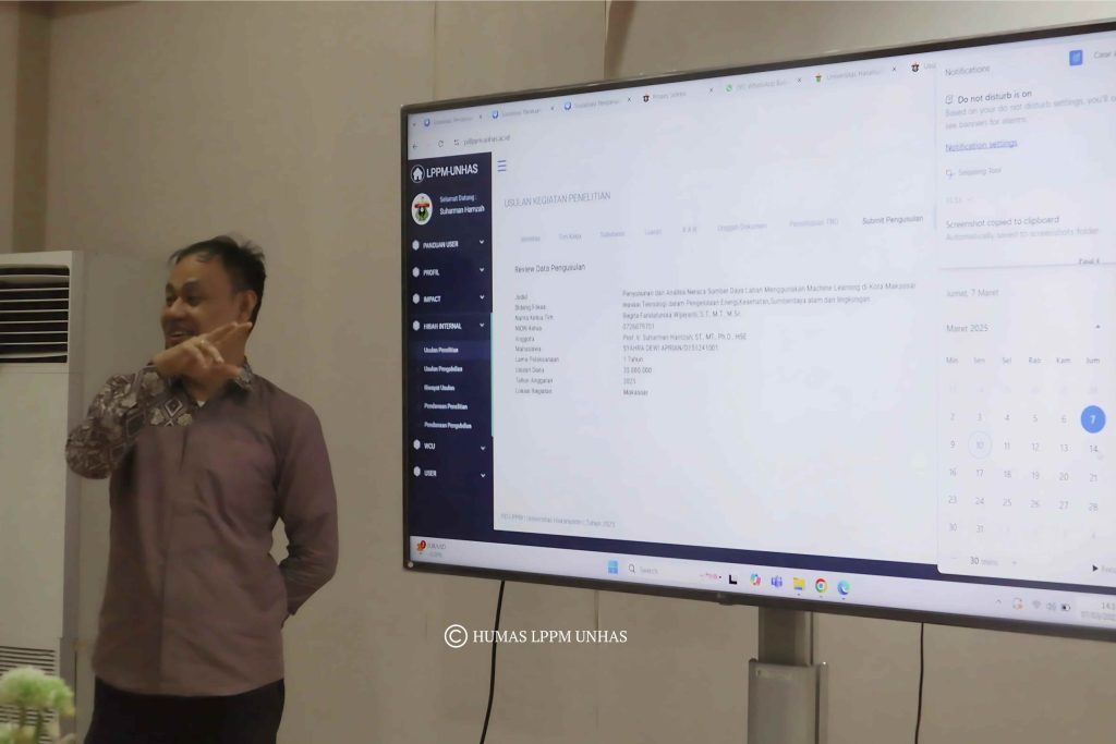 Bertempat di Ruang Rapat A, Gedung LPPM Unhas, penyampaian ini membahas secara komprehensif skema pendanaan penelitian, mencakup mekanisme hibah, prosedur pengajuan proposal, serta peluang kolaborasi antarpeneliti lintas disiplin ilmu.