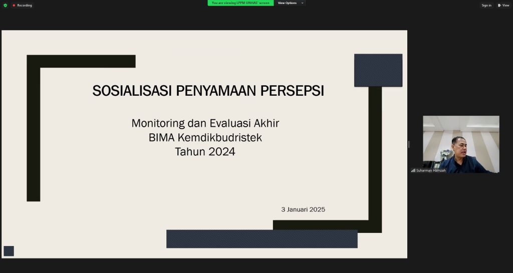 Makassar, 3 Januari 2025 Lembaga Penelitian dan Pengabdian kepada Masyarakat (LPPM) Universitas Hasanuddin (UNHAS) mengadakan kegiatan sosialisasi Penyamaan Persepsi mengenai Monitoring dan Evaluasi (MONEV) Akhir Program BIMA Kementerian Pendidikan, Kebudayaan, Riset, dan Teknologi (KEMDIKBUDRISTEK) Tahun 2024. Kegiatan tersebut dilaksanakan melalui platform Zoom pada hari ini, diikuti oleh para Reviewer dan pihak terkait yang terlibat dalam program tersebut.